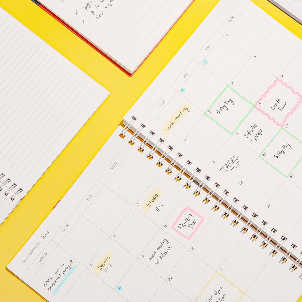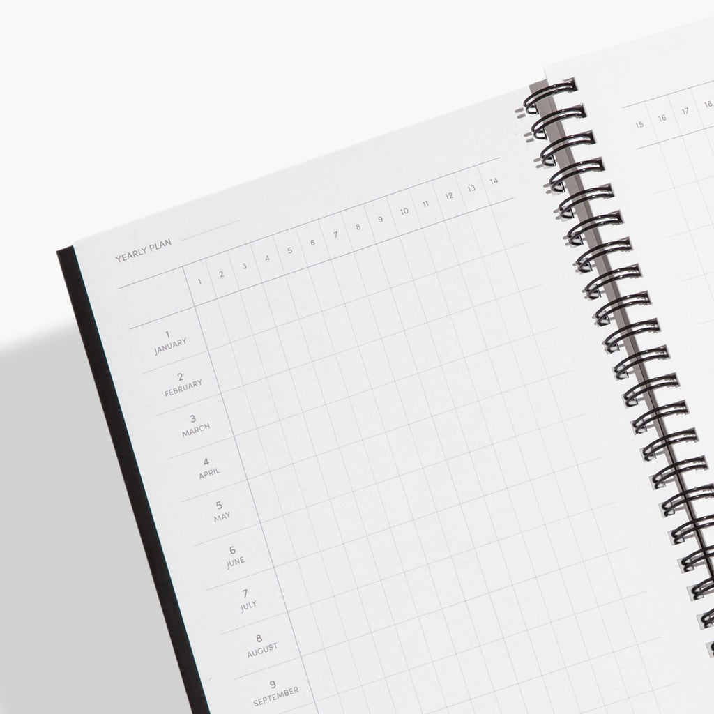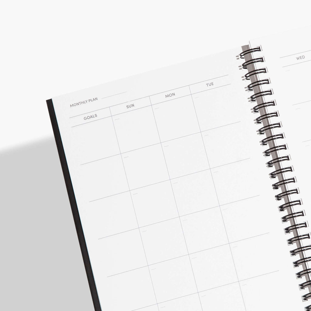 This open-dated planner features space to timestamp events and tasks, room for notes and sketches with matching spiral binding for ease of use. Includes daily, weekly, monthly, and yearly sections complete with a place for notes and monthly goals. Also features 2 pockets in the back to organize any loose-leaf paper you come across throughout your day.
