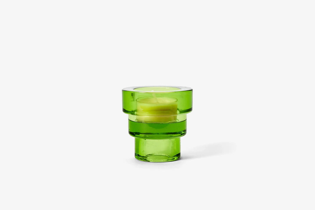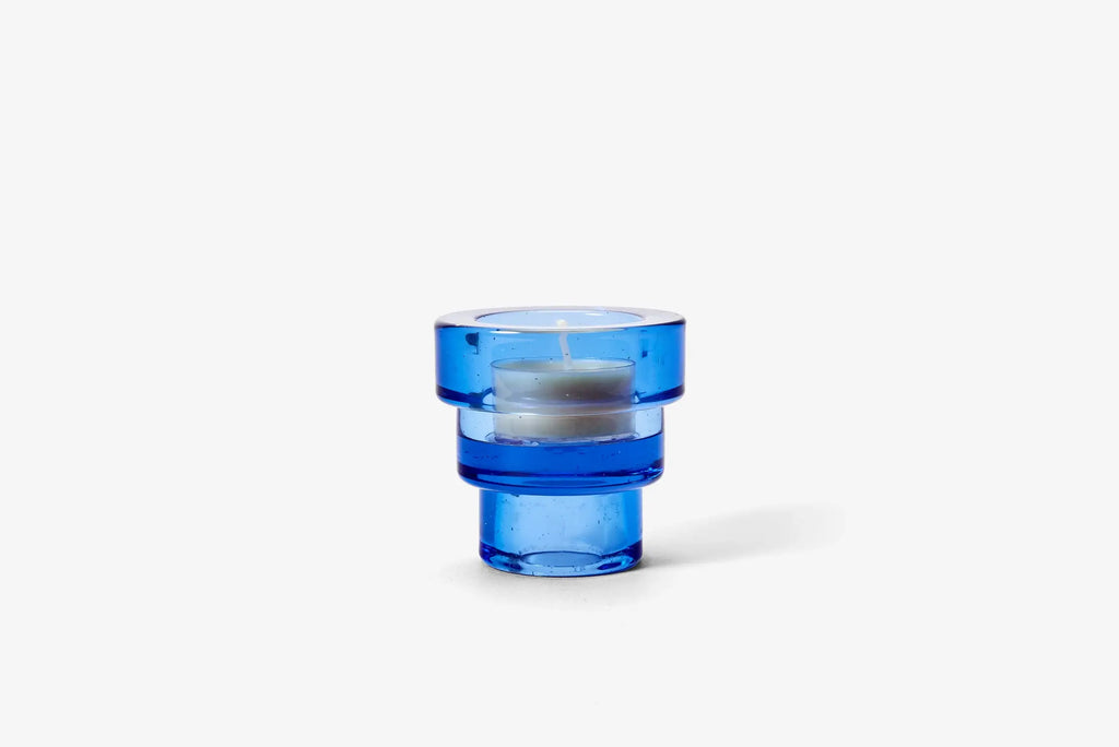 A glass candle holder with a layered design that resembles terraced hillsides. Flip it one way to burn a taper candle, and the other to burn a votive.