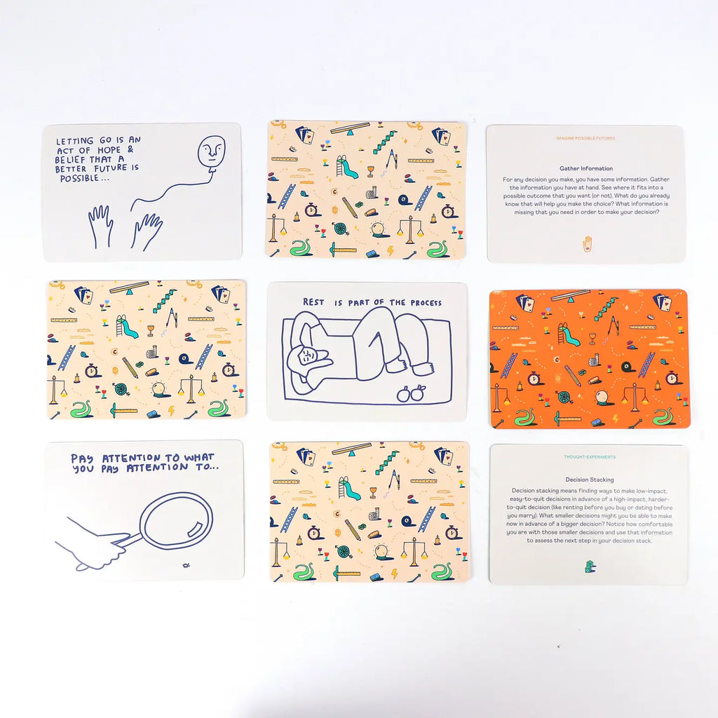 The How To Decide deck offers different frameworks for thinking about the situation you are in and picking a route forward. When you feel stuck, choose an exercise or thought-experiment and see what comes up.