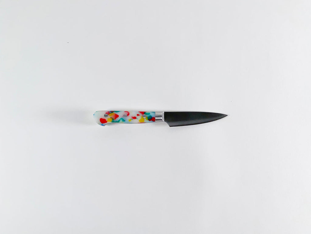 This paring knife is brings together a high quality steel blade and a festive, speckled handle made from the same material as our cutting boards. It's the smallest knife in the block, and ideal for cutting peaches, plums and pears.