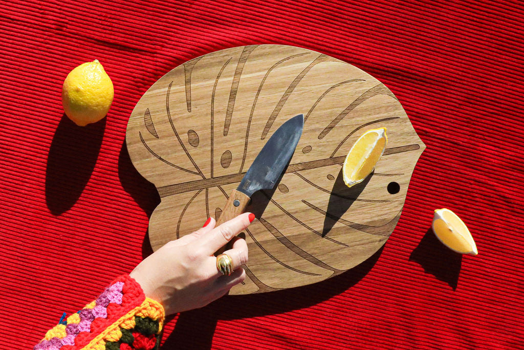 Monstera-shaped cutting and serving board, made of engraved wood, that hides a magnetized knife in its stem. Can be hung easily.